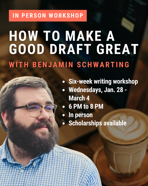 If you’re anything like me, you’ve learned that writing the first draft was only the beginning. The purpose of this six-week workshop is to equip beginning and intermediate authors with the skills, priorities, and vision they’ll need to make a good draft great. Sessions will span the entire breadth of the writing process, including pre-writing skills (such as outlining and world-building), developmental editing tasks, how to effectively utilize alpha and beta readers, and how to polish your prose before publication or agent submission. Writers of all genres of narrative fiction are welcome.